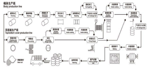 目前四方正在按照中央精神,撸起袖子准备大干,他们已经完成了太仓工厂生产线的改造,改造后的钢桶生产线自动化程度很高。生产线上采用了桶底顶错位冲压后自动预卷烘干、堆垛、输送、拆垛、自动上盖。后段采用自动寻缝、自动检漏、然后自动粘标、喷涂、撕标、寻桶口、废气置换、充干燥气体、自动上口盖等。我们紧接着参观了四方太仓工厂。