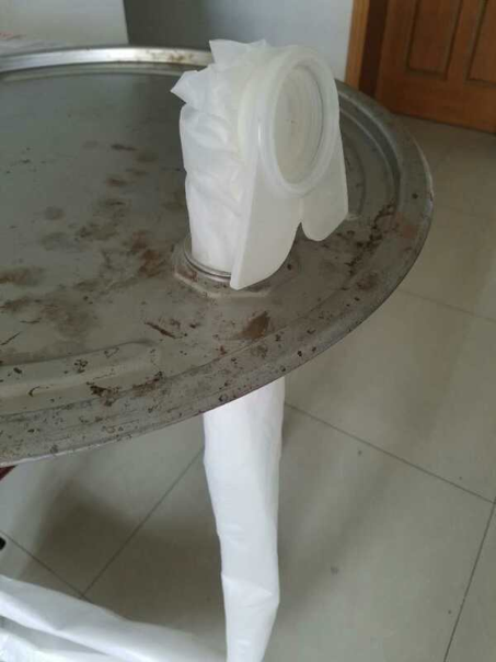 1、内衬袋从包装盒中取出,将下端束袋用胶圈从袋底退出,然后装入钢桶封闭器大口;