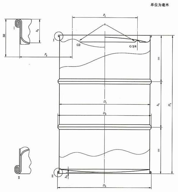 6.3 桶身通过涨筋或滚压两道环筋增加强度,位置如图1所示。也可以采用不同结构的环筋和波纹。