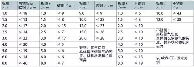 材料是保证产品质量和精度的前提条件,简单地说,就是要“对症下药”,材料的差异对下料、折弯、焊接等工序影响较大,如,材料表面状况不好,就要调整切割条件;板厚不足,折弯扣除要做相应减少;含杂质多,焊接变形大,就要提前做好预防措施等。在数冲时,依据毛刺高度可以判断模具是否需要研磨,判断标准如表8所示。依据激光切割件断面质量以及表面粗糙度Rz值,可以判断机床及耗材的实际状况等,如表9所示。由于板厚的偏差,造成折弯扣除的数值也有一定的差别,如对材料SPCC-SS400进行90°折弯,且折弯上模rp≤0.6mm时,常用的折弯扣除值如表10所示,具体取值可通过现场试折验证。如Q235(SS400)钢板的厚度为5.0mm,实测板厚为4.65mm,那么BD的取值就不能按表选取,只能通过试折来进行取值了。