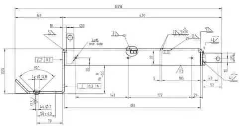 一些厂家对钣金件的要求,特别是尺寸和外形验收标准,是依照ISO 2768 mK或GB/T 1804-m执行的,所有线性尺寸极限偏差的取值如表2所示。在加工材料为SUS304、板厚为5mm的大部件(图1)时,在不考虑平面度和垂直度的前提下,仅就一个长度尺寸559±0.8mm,其精度就不容易保证,而在生产相同材料且板厚为8mm的小部件(图2)时,合理的加工工艺又该如何选择呢?