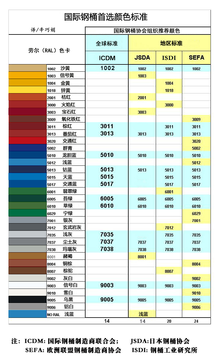 为了环境保护,减少污染,简化工艺,节省资源,国际钢桶协会组织多年来一直致力于减少钢桶颜色,规范钢桶统一颜色的标准化工作。2017年国际钢桶协会(ICDM)再次修订了钢桶颜色标准,现公布于下,请各企业遵照执行。