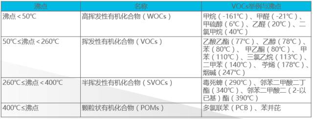 指沸点范围在50~260℃之间,室温下饱和蒸气压超过133.32Pa,在常温下以蒸气形式存在于空气中的一类有机物。按挥发性有机化合物化学结构可进一步分为8类:烷类、芳烃类、烯类、卤烃类、酯类、醛类、酮类和其他化合物