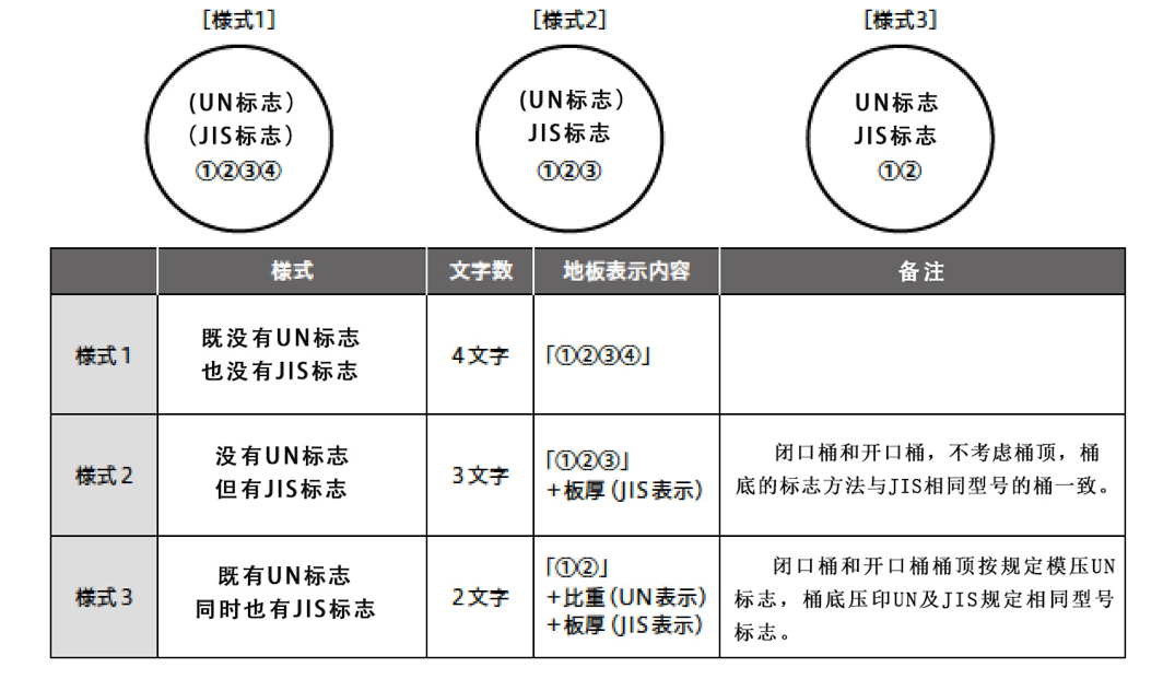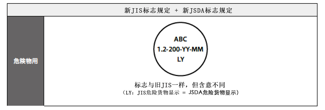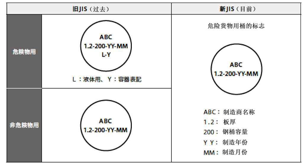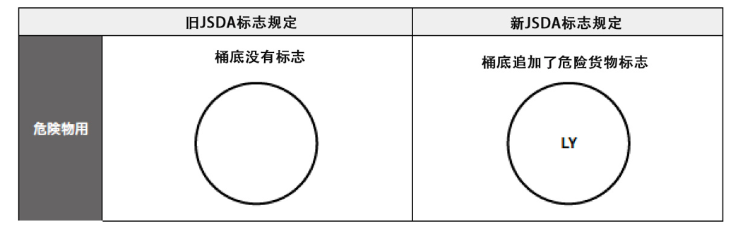 石油桶工业协会根据消防法,制定了在日本国内公路运输危险货物所用钢制油桶系列包装自主检查实施细则,即《危险货物运输用金属包装桶的安全性能确认自主检查》(JSDA标志制定规则)。这次JIS标准修订几乎延用了旧标准中桶底危险货物的标志,而JSDA新标准在桶底上追加了旧标准没有的危险货物标志。