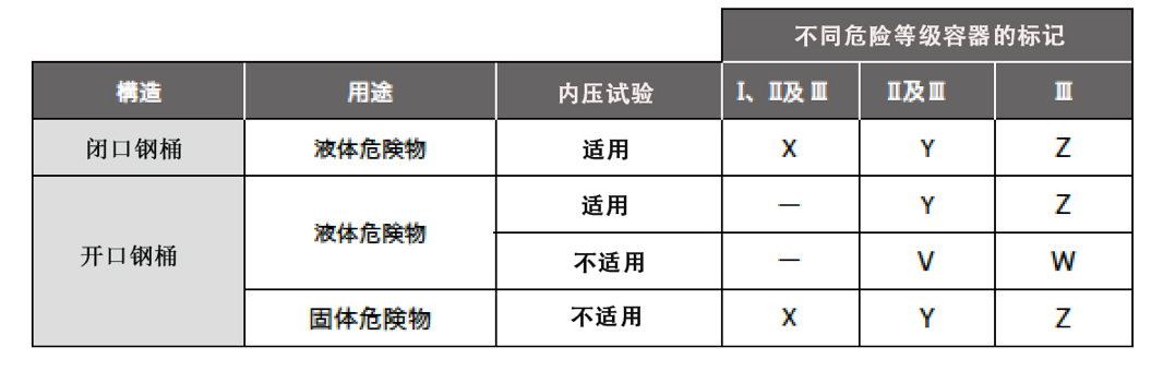 关于危险货物的运输,联合国危险货物运输专家委员会的“关于危险货物运输的建议书”是日本国内危险货物运输的法律基础。根据建议书的内容和国内法律法规的要求,JIS Z 1600:1993与 JIS Z 1601:1993标准中规定了用钢桶盛装固体和液体危险货物时的性能试验方法及标识(危险货物用容器的标识)。