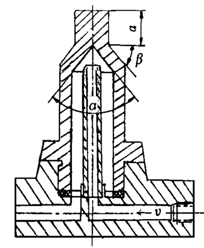 针对这种特殊要求的电极压头, 设计上采用了高强度、高硬度的Cu-Be-Ni合金电极材料,由于这种材料具有电阻率d比一般电极材料高, 而热导率w又比一般电极材料低的缺点, 所以在使用中必须采用强制水冷却方法加以克服。在设计中, 考虑到钢桶提环座对电极压头空间的约束, 电极压头有一个极限尺寸, 由于体积尺寸小, 电极压头只能选简单的水冷方式。通过对凸焊连续焊接过程中电极压头静态压力、动态压力、动载荷、压杆稳定及焊接电流产生的内阻热、焊接电阻热精确的计算, 得到了电极压头允许的最佳结构及横截面积大小。通过计算机辅助设计和模拟焊接, 确定了关键参数a , T, U及冷却水流量v (图1)。