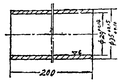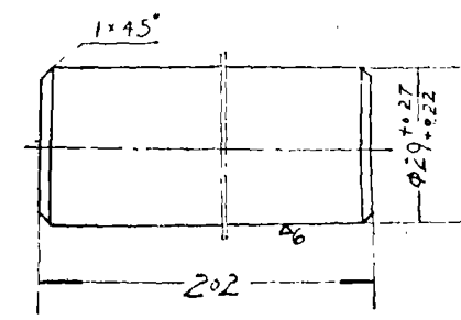 我厂在200千伏安点焊机上采用自制电极夹头见图4。这平夹头与图1、图3的电极与夹头毫无共同之处,这一电极夹头是由:Φ36×4H62黄铜管(见5),中心压入Φ29钢棒(见图6)伏主夹头,再用39×62×128黄铜板经机械加工后(见图7)与主夹头相配钎焊,锥形盲孔夹持活动电极,两侧铣出8×6冷却水槽,然后表面覆盖板并钎焊,出口(水)入口处焊管接头。