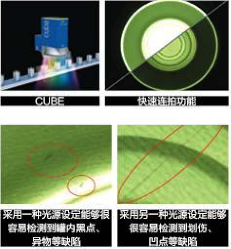 与上一代的Ultra Compact VIS 和 Compact VIS相比,Cube检测速度高达6000个产品/分钟。具有快速连拍功能,即对于同一种产品,可预先在系统中设置几种不同的光源设定参数,检测过程中对于同一个盖子或罐,Cube可以采用不同的光源设定瞬时的拍摄几张照片,通过这种方式可以轻易地将以前难以检测到的划伤、凹点等轻微缺陷检测出来。相机分辨率支持最高1200万像素;采用RGBW(多色光+白光)多色光源,更好地适应各种颜色产品的检测,带来更佳的检测效果;自动设定功能,轻点一下鼠标即可实现自动设定光源,搜索物体中心等功能,简单易用。