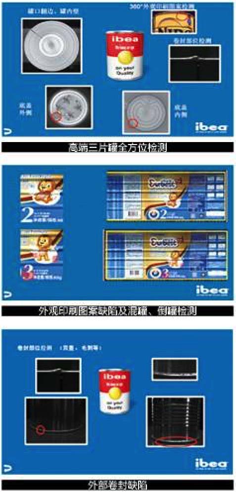 ibea为高端三片罐产品,例如奶粉罐,提供360度全方位检测方案,100%在线检测,最高检测速度可达1500个罐/分钟,系统采用模块化结构,客户可以选择整线方案,也可以选择其中部分模块钱,方便灵活配置。