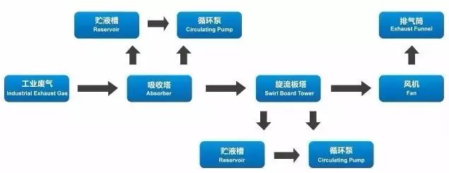 气流通过叶片时产生旋转运动,清洗液喷射在旋转叶片上,并溅向周围叶片而形成薄液层,被旋转向上的气流剧烈搅动而成为细小液滴,由于气流在通过塔板叶片时旋转而产生的离心力将液滴甩向塔壁,液滴因重力作用集流至溢流口,通过溢流装置流到下一块旋转板的盲板区。连续对漆雾进行多级收集处理,能圆满完成清理过程。