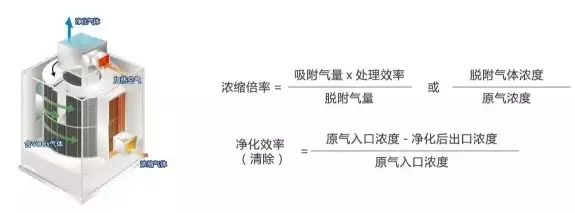 含有低浓度VOCs的废气通过蜂窝状沸石时,VOCs成分被吸附在沸石中,净化后的气体排放到大气中。此时,已吸附VOCs的蜂窝沸石转轮连续旋转,通过少量的热空气对沸石模块进行解吸再生,在此过程中,能够将低浓度的废气浓缩成高浓缩废气。