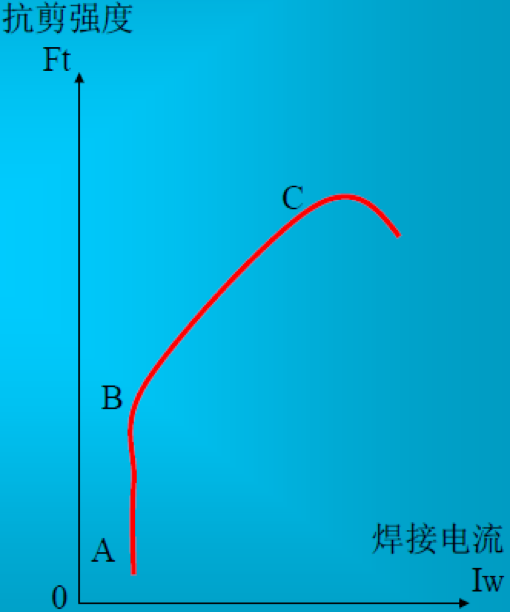焊接时电流选用应接近C点处,抗剪强度增加缓慢,越过C后,由于飞溅或工件表面压痕过深,抗剪强度会明显降低。