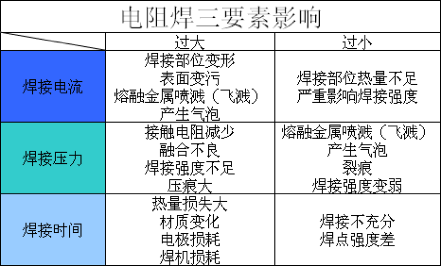 影响因素:电流、焊接时间、电阻、电极压力、电极形状和材料性能、工件表面状况等。