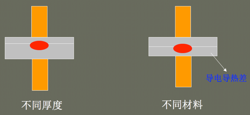 厚度不等时:熔核偏向厚件。