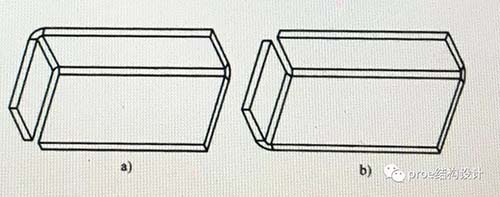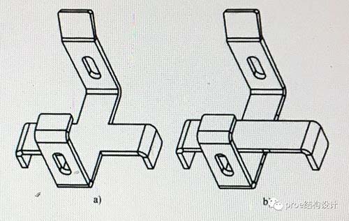 当折弯为斜边时,最容易发生因折弯高度太小而造成折弯扭曲变形的情况,如图,原始设计中,由于最左边折弯高度太小,折弯时容易发生扭曲变形,造成折弯质量低,在改进的设计中,可以增加左侧折弯的高度或者去除折弯高度较小的部分,这样钣金折弯时不会发生扭曲变形,折弯质量高