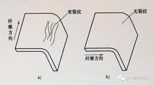 钣金折弯时应尽量垂直于金属材料纤维方向,当钣金折弯平行于金属材料纤维方向时,在钣金折弯处容易产生裂纹,这样强度低,易断裂