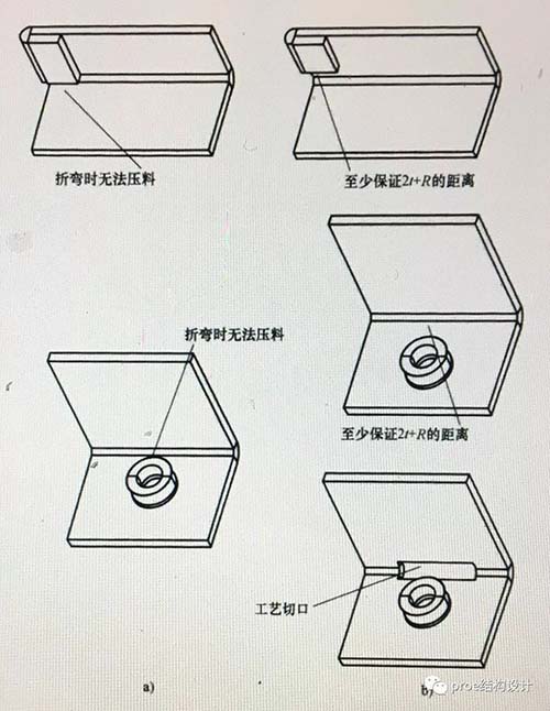 如图上部所示原始设计中,反折压平位置太靠近钣金折弯根部,造成钣金折弯时不能压料而折弯失败;如图下部所示原始设计中,钣金抽牙太靠近折弯根部而造成折弯无法进行,此时可以把抽牙移动到远离钣金根部位置,如果因为设计要求,抽牙和折弯的位置都无法移动,那么可以在抽牙对应的折弯根部增加一个工艺切口,从而保证折弯顺利进行