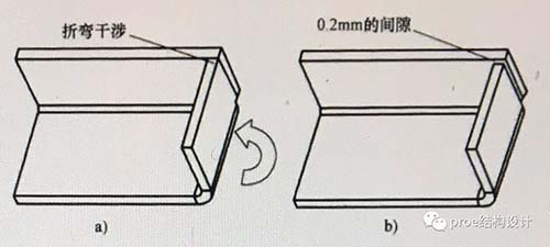 如图的零件折弯顺序为上侧边先折弯,右侧边后折弯,原始设计中,两个折弯没有间隙,当上侧边折弯完成后,再将右侧边折弯时,由于钣金折弯公差的存在,很可能造成右侧边在折弯过程中与上侧边造成干涉,改进的设计中,右侧边与上侧边至少保留0.2mm的间隙,可以有效避免干涉