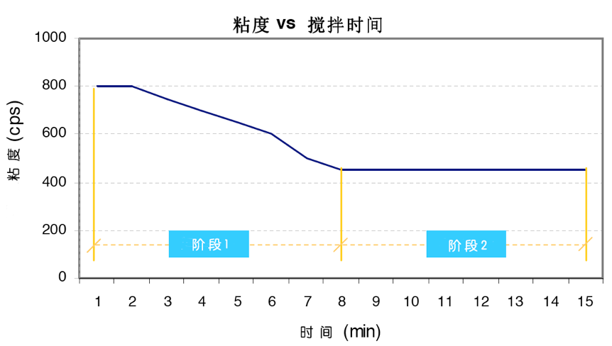 下表为密封胶粘度与搅拌时间的关系。第一阶段为分解结构和均化密封胶阶段。第二阶段为稳定粘度阶段。从表中可以看出,密封胶使用前的搅拌,共需要15分钟的时间。