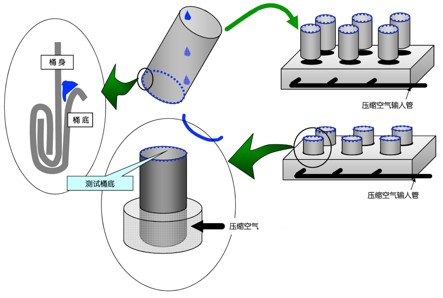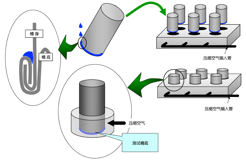 (2)对于压力容器,如气雾罐等,将染色试验剂涂在卷边内缝上,在容器内通入压缩空气,检查染色试验剂是否从卷边外缝渗出,从而判断其密封性能。