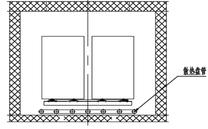 根据图9情况分析,加热能源采用导热油或燃煤加热,加热装置分布在烘道内底部,采用放热管均布,没有循环风和调风系统。