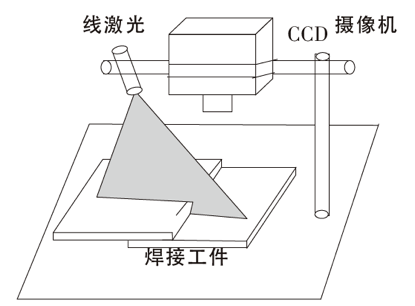 基于结构光的搭接焊缝的特征点提取原理如图1所示。整个视觉系统主要由CCD摄像机、线结构光发射器、滤光片等部件组成。CCD摄像机垂直于焊接工件,线结构光发射器发射出一条细长的红色线条打在工件上,滤光片安装在镜头前方以滤去部分干扰光信息。