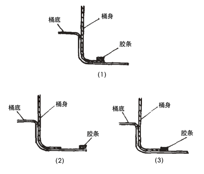 我厂使用的EP胶是作为出口包装的密封填料,该胶是一种固态发泡型胶条,粘贴上这种胶条后,能使钢桶跌落后随钢桶的变形而变形,并能填充卷边变形后的空隙,具有很好的密封效果。但在胶条的粘贴方式上,不同的粘贴方式其密封效果大不一样。我们就下面三种方式进行了试验:按粘贴位置分为三组(见图5),每组做20只钢桶。