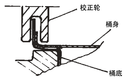 在卷边前的半成品阶段,有的需要进行化学处理,或其它表面处理,由于来回周转搬运次数频繁,不可避免地要碰伤钢桶,使钢桶底、盖裙边和桶身扳边部位碰撞变形、损伤,引起卷边质量波动,出现各类缺陷。因此,应增加桶底、盖和桶身组合后,卷边前的桶底、盖裙边、桶身扳边处的整形校正工序。