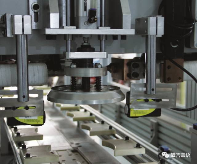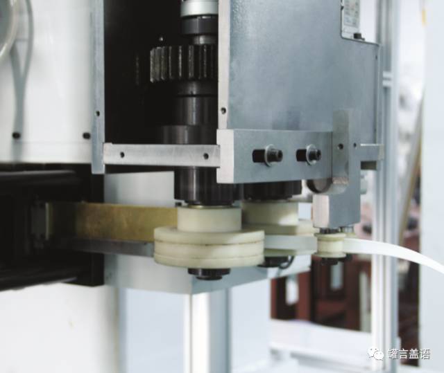 图4 YDT—60S实现了单机一次性完成金属罐上塑料提手的全自动高速制作和安装,集塑料提手冲制成型、提手焊耳位冲孔、焊耳点焊于一体,彻底消除了传统生产工艺中人工挂提梁的需要。(由上至下依次为塑料带供给结构、寻焊缝定位。)
