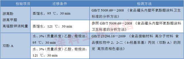 水基改性环氧树脂涂层的卫生标准为GB11677—2012《食品安全国家标准易拉罐内壁水基改性环氧树脂涂料》,该标准对游离酚的要求为不得大于0.02mg/dm2,从表2可见,本次检测的10批次样品中,按标准的浸泡条件(95℃,30min)进行试验时,结果均小于0.02mg/dm2;而按121℃,30min进行试验时,结果均有检出,有1批次的结果为0.020mg/dm2,若与GB11677—2012要求进行比较的话,已经出现在标准要求的临界值,值得注意。