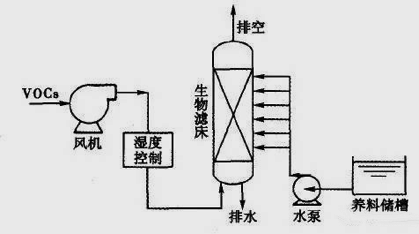 生物过滤法处理VOCs,这种有机废气,主要是工业生产、市政污水、污泥处理的主要来源。为了治理恶臭气体,提出了生物过滤法这种技术,近年来,随着科学的发展,发现这种处理方法对处理VOCs也有较好的效果。这种生物过滤法,可以处理较低浓度的VOCs,核心处理设备是生物滤床的作用(如图1所示),VOCs可以在生物滤床中得到处理,使VOCs生成CO:和HO,这主要是由于在滤床内,已经装有能形成生物膜的填料,这些填料可以使VOCs在滤床里被生物膜上的生物经过吸附作用,将VOCs分解成CO2和H2O,使它们排放到空气中得到净化。