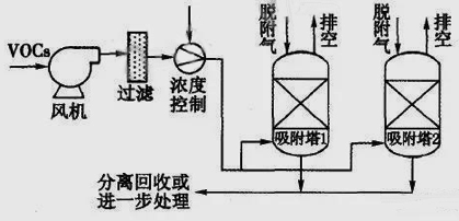 吸附法是利用具有微孔结构的吸附剂,它的方法是利用这种吸附剂,可以将空气中的吸附质吸附在吸附剂的表面上,通过吸附剂的吸附将有机物从主体中分离,这样就可以处理有机废气。吸附法工艺流程如图2所示,当VOCs通过风机的作用,使它输送到吸附塔1,当吸附塔1中达到吸附饱和后,就可关闭阀门,再将VOCs气体切换到吸附塔2进行吸附,由于VOCs是分别在塔1和塔2进行脱附,它们是相互交替操作,因此,只要设计合理,就可以达到连续处理的结果,使VOCs得到净化。目前常用的吸附剂:由于活性炭的性能较好,这主要是活性炭具有较大的比表面积,这就使活性炭具有较高的吸附容量,使VOCs得到较大的;另一种方法就是沸石分子筛,这种吸附剂它具有均匀的微孔结构,就可以使这种微型结构具有较强的选择性。就可以使它们具有较大的优势,在吸附VOCs的过程中,它们都具有较高的去除效率,就可以使它们达到吸附VOCs的作用,同时由于它们的能耗低,工艺成熟,因此,这种方法在一般的企业都易于推广实用,来处理VOCs使其净化。