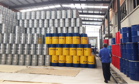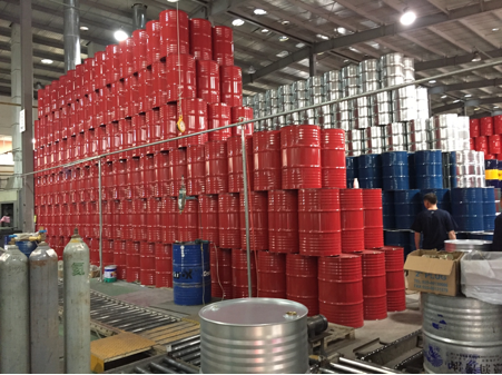 成品库现场,钢桶堆码六层高(采用机械码桶机)